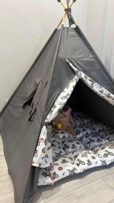 - Комплектация на фото: палатка с раздвижными шторками на завязках, мягкий напольный мат из стёганых подушечных секций, подушки; у некоторых моделей — карман сбоку.