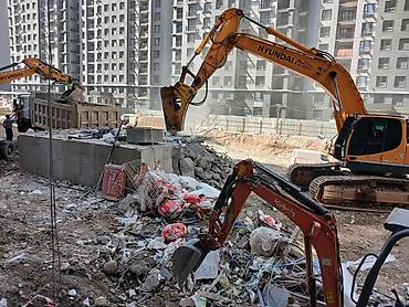 - Навеска: несколько ковшей (разных размеров для траншей/планировки), гидромолот для разбивки бетона/камня, поворотный отвал.