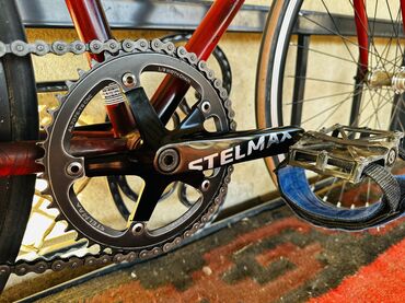 - Привод: одноступенчатый фикс (фиксед-сингл). Передняя звезда STELMAX CNC (AL 7075 T6), под цепь шириной 1/8". Кривошипы STELMAX.