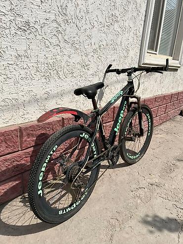 - Колёса: 26" или 27.5" (по фото — широкие обода с деколями Jeep MTB), покрышки универсального протектора для грунта и асфальта.