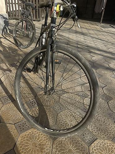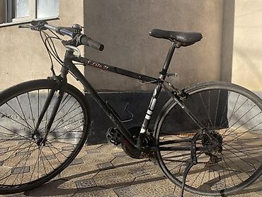 Городской/гибридный велосипед с прямым рулем и узкими гладкими шинами для асфальта.