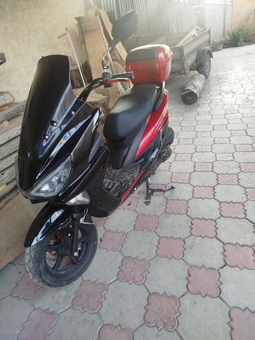 Скутер/мопед 50–125 см³ (визуально компактный городской класс) Описание и особенности: - Кузов в спортивном стиле, черный цвет с красными акцентами и декоративными стикерами. - Высокое лобовое сте...