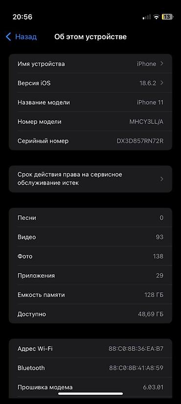 IPhone 11, 128 ГБ Все родной!!! - Модель: iPhone 11 (номер модели MHDH3RU/A) - Память: 128 ГБ, доступно ~6.8 ГБ на момент снимка - Версия iOS: 18.4.1 - Цвет корпуса: черный - Экран: 6.1", поддержк...