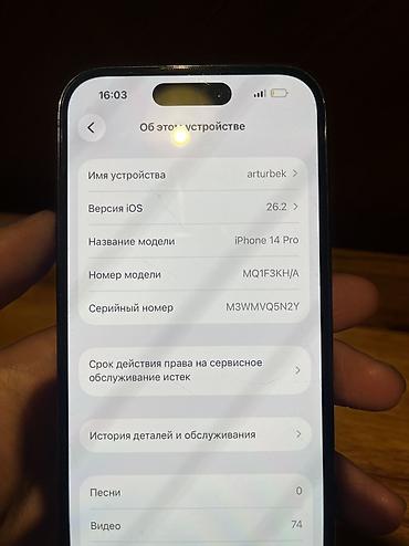 IPhone 14 Pro, 256 ГБ, цвет Deep Purple Характеристики: - Модель: iPhone 14 Pro (MQ1F3X/A видно на фото экрана “Об этом устройстве”) - Память: 256 ГБ (доступно ~239 ГБ) - Экран: 6.1", OLED Super R...