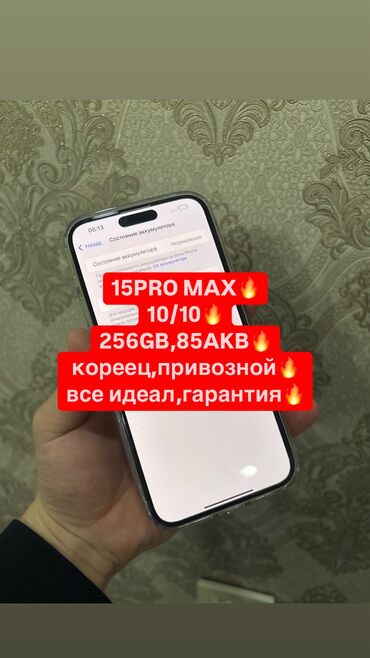 IPhone 15 Pro Max, 256 GB 🔥 Цвет: титан ✨ Состояние: идеальное — без сколов и царапин 📱 Оригинал, корейский, привозной 🔋 Аккумулятор: 85% (594 цикла) 🚀 Работает идеально, внешний вид как новый цена...