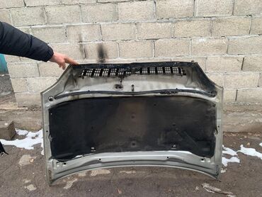 Капот автомобиля, белый, с центральной вентиляционной вставкой/жалюзи. Материал — металл. На правой стороне имеется участок с сильными повреждениями и трещинами, по поверхности видны царапины и сле...