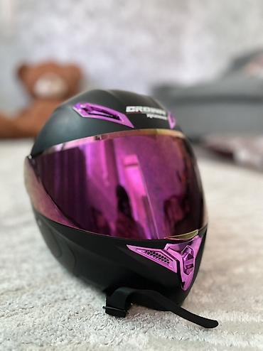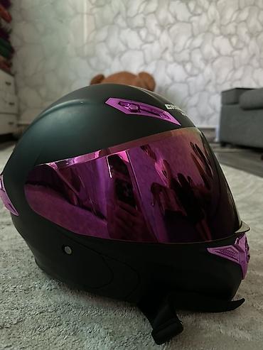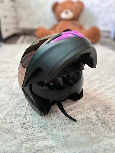 - Визор: зеркальный фиолетовый, широкое поле обзора; внутренние затемненные очки-капли (встроенная солнцезащитная шторка)