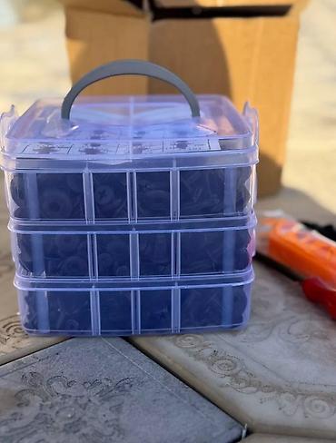 - 3 яруса прочного прозрачного бокса с ручкой, ячейки подписаны по типам и размерам (на схеме внутри указаны артикулы и диаметр шляпки/ножки).