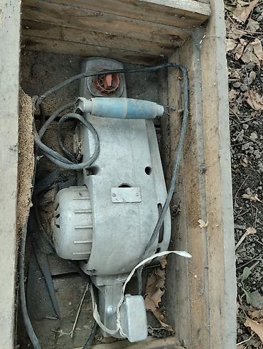 - Крупный электрический инструмент/моторный агрегат в деревянном ящике (алюминиевый корпус, ремённый/редукторный узел, выключатель на корпусе) — для стационарной работы, возможно шлифовально-резательный/заточной блок.
