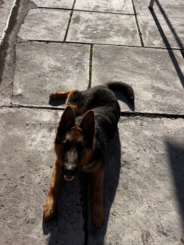 Немецкая овчарка, классический чепрачный окрас (черный с рыже‑палевыми подпалинами). Пропорциональное телосложение, крепкий костяк, выразительная голова, стоячие уши, густая двойная шерсть. Хорошо выраженная грудь и спина, мощные лапы, живая мимика.