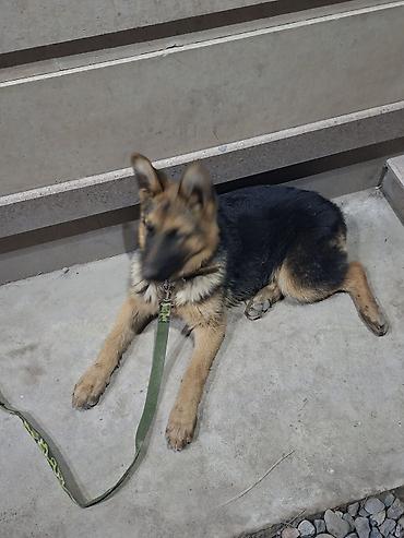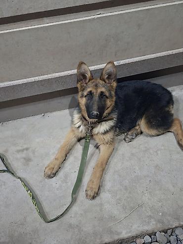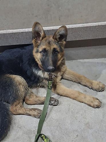 Немецкая овчарка, молодая собака классического чёрно-рыжего окраса. Пропорциональное телосложение, крепкие лапы, крупные стоячие уши, выразительная маска. На фото — на поводке-рулетке камуфляжной расцветки с ошейником. Подходит для активной семьи или охраны частного дома: внимательная, ориентирована на человека, быстро включается в работу и удерживает контакт. Порода отличается обучаемостью, надёжностью и хорошими сторожевыми качествами.