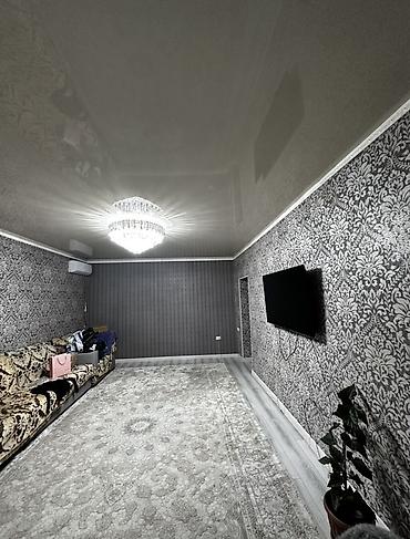 - Большая прямоугольная комната с натяжным глянцевым потолком.
