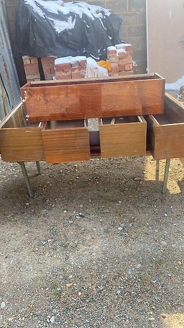 - Конструкция: корпус с распашными дверцами и блоком из нескольких выдвижных ящиков разной ширины.