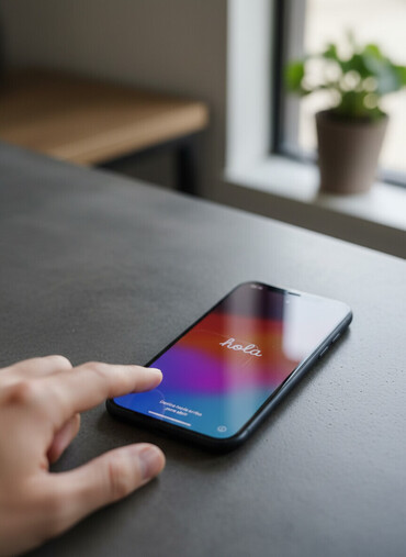 Примечание: устройство отображено с испаноязычным экраном приветствия «Hola» и надписью «Desliza hacia arriba para abrir». Комплектация на снимках включает кабель Lightning. Хранение/объём памяти на фото не указан.