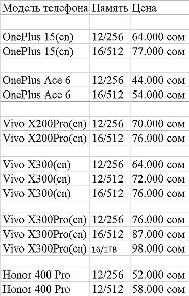 OnePlus 15(cn) по памяти 12/256 16/512 64.000 и 77000 сом. заказываю любые телефоны в любых конфигурациях по памяти (срок до 1 месяца) предоплата 50% от стоимости устройства.