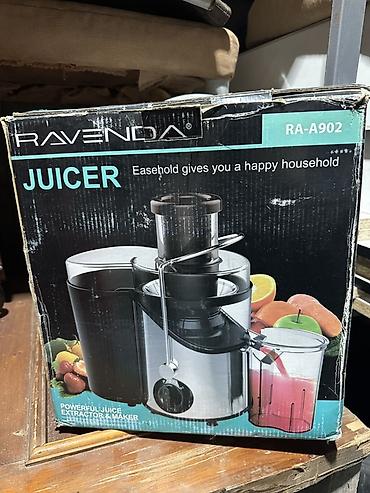 На коробке: Juicer Ravenda RA-A902, Powerful Juice Extractor & Maker, слоган Easehold gives you a happy household. В комплекте — основные разборные части, толкатель и документация, как на фото.
