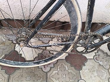 - Колеса: 700c, покрышки шоссейные/трековые разной расцветки (передняя черная, задняя с бежевым бортом).
