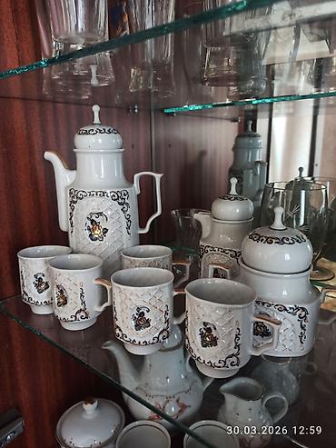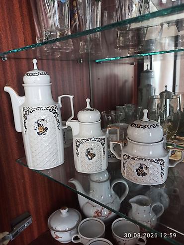 - Комплектация на фото: высокий кофейник/чайник с крышкой, молочник/сливочник, сахарница с крышкой, набор кружек (около 6 шт.).