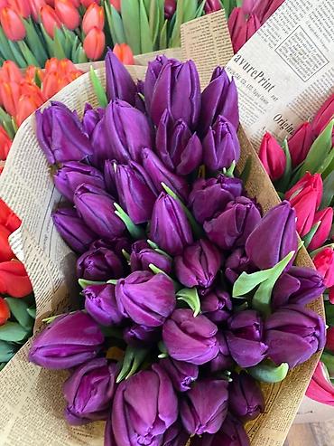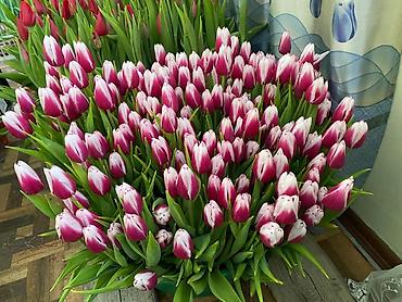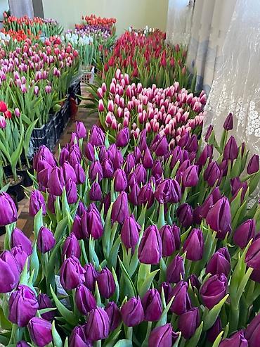 - Ассортимент: классические однотонные и двухцветные тюльпаны. На фото представлены оттенки: пурпурный, красный, розово‑кремовый с жёлтым, малиново‑белый с каймой.