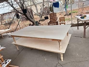 Низкие деревянные дастарханы/тақтаны для пола с узорной инкрустацией. - Материал: массив/фанера светлых пород, точёные ножки. - Формат: прямоугольные, складные по центру (столешница из двух полови...