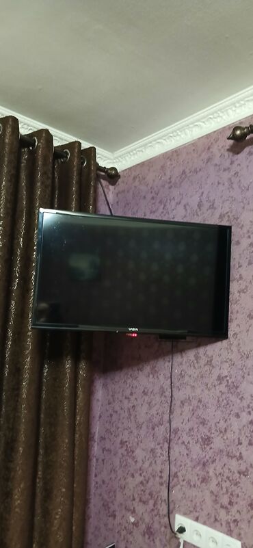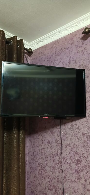 Телевизор VASIN, диагональ примерно 32–40". Плоская панель, тонкая рамка. Установлен на настенном кронштейне, питание снизу по центру, индикатор состояния спереди. Подходит для гостиной или спальни, удобен для настенного размещения. Есть разъёмы для подключения внешних устройств (расположены на задней панели). Комплект: сам телевизор; при необходимости можно использовать существующий настенный кронштейн. Отличный вариант для просмотра эфирных каналов и подключения медиаприставок/консолей.