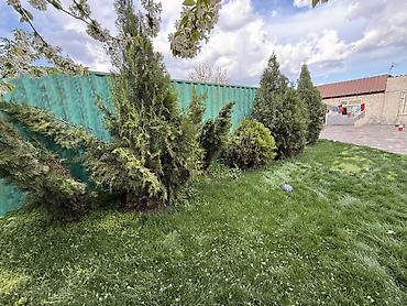 - Туи колонновидные (высота ориентировочно 2–3+ м) — сформированные, создают плотный зеленый экран.