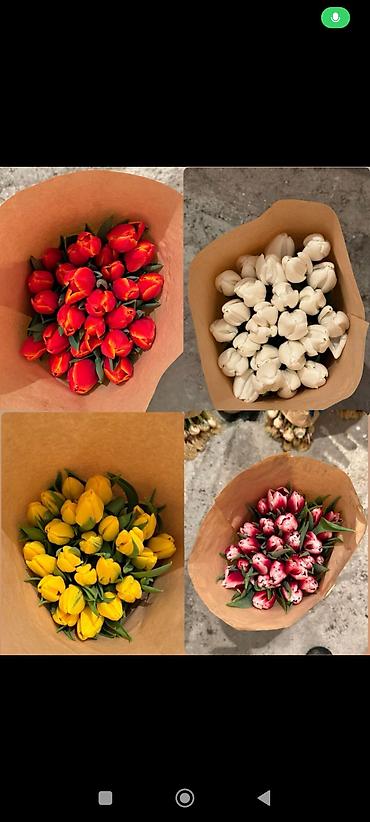 На фото — реальные тюльпаны из теплицы и примеры готовых букетов.