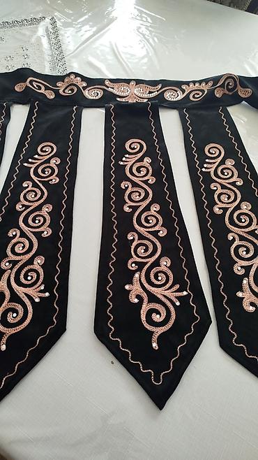 - Отдельный декоративный элемент на поясе: широкая полоса с тремя ниспадающими планками с остроконечным низом и симметричной вышивкой.