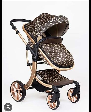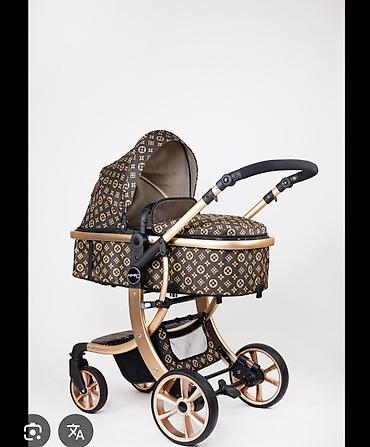 Универсальная детская коляска с возможностью трансформации из люльки в прогулочный блок. Коляска выполнена в коричневом цвете с узором, напоминающим монограмму известного бренда, и имеет прочную раму золотистого оттенка. Сиденье является реверсивным, что позволяет устанавливать его лицом к родителю или по направлению движения. Ручка коляски регулируется для удобства управления. Колеса оснащены золотистыми дисками, подчеркивающими общий стиль. Под сиденьем расположена корзина для покупок или детских принадлежностей. Эта модель подойдет для комфортных прогулок с ребенком.