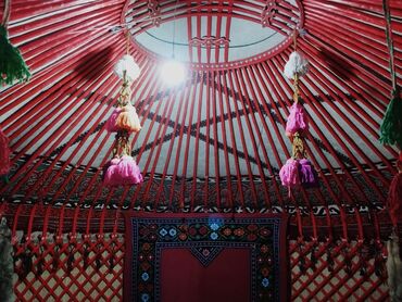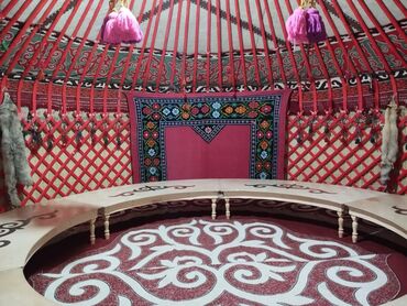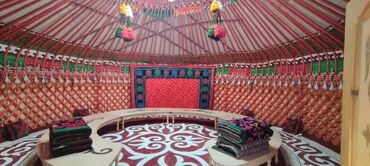 Аренда юрты аренда юрты аренда юрты Аренда юрт Аренда юрты аренда юрты Юрта для мероприятий с национальным декором - Традиционная сборная юрта округлой формы с орнаментами по периметру и на крыш...