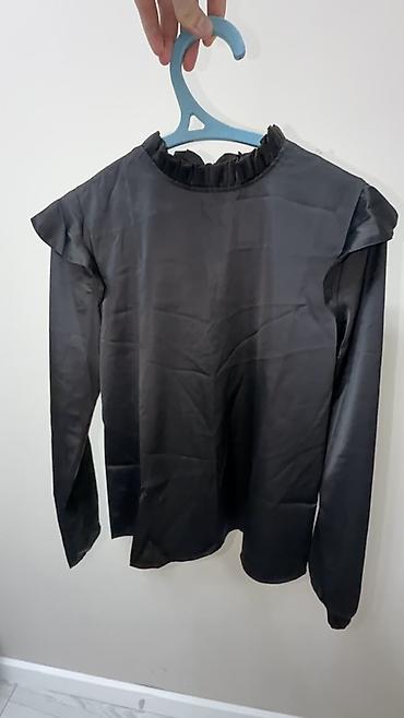 Черная женская блузка на пуговицах. Материаль : атлас. Размер s - Классический фасон: отложной воротник, длинный рукав, застёжка на мелкие круглые пуговицы спереди. ...
