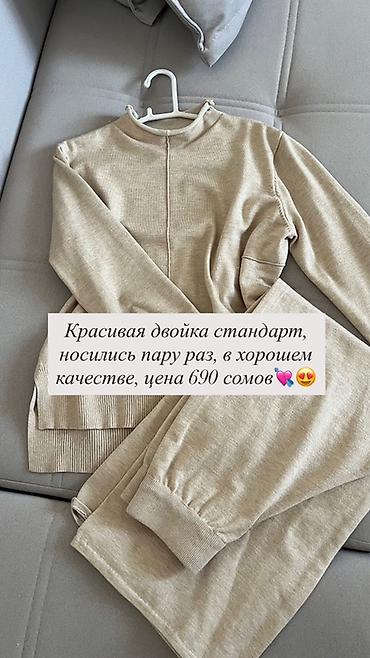 1) Комплект “двойка”, стандарт. Бежевый трикотаж: свитшот с центральным швом и манжетами + прямые брюки на резинке. Цена: 690 сомов.