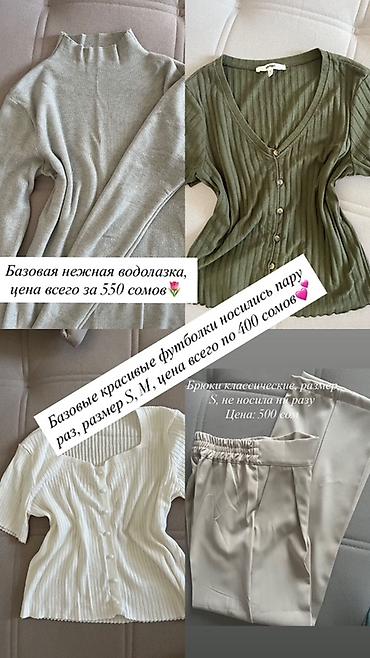 8) Базовые красивые футболки/топы в рубчик, размеры S и M, два цвета (оливковый и молочный), на пуговицах. Цена: по 400 сомов.