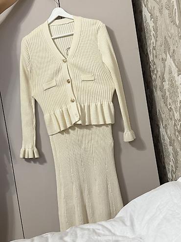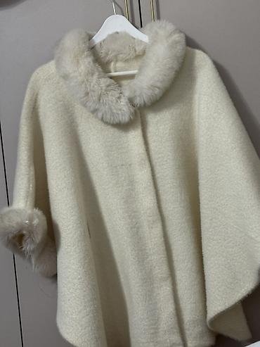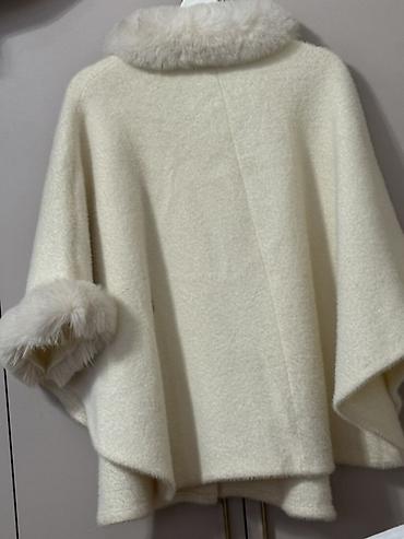 Накидка-пончо с капюшоном и отделкой «под мех» - Цвет: белый - Силуэт: свободное пончо с удлинённой спинкой - Капюшон большой, окантован пышным искусственным мехом «под кролика» - Края изделия и м...