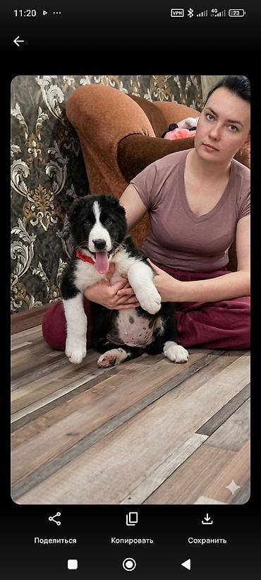 Щенок среднеазиатской овчарки (Алабай), черно-белый окраc, с ярким белым «блеском» на морде и лапах. Возраст — щенок, крепкий костяк, пропорциональное телосложение, правильная посадка хвоста и ушей. Носит красный ошейник.