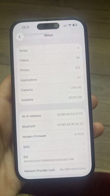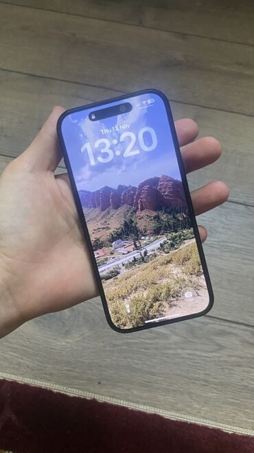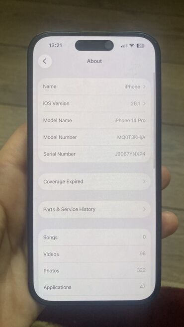 IPhone 14 Pro, модель MQ0T3KH/A, серийный номер J9067YNXP4. Цвет — тёмный (Space Black). На экране — Dynamic Island.