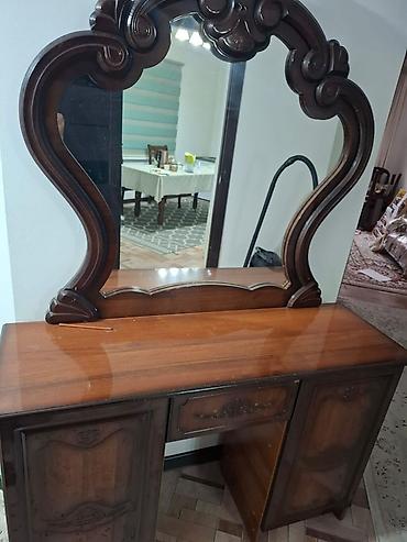 - трюмо (туалетный стол) с большим фигурным зеркалом; столешница под дерево, центральный выдвижной ящик, боковые тумбы с дверцами;