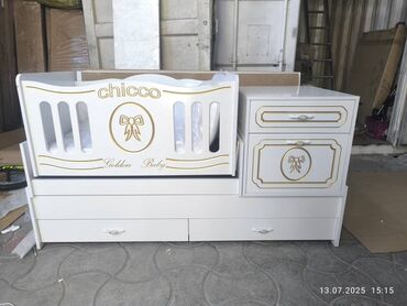 Также на фото — модульная детская кроватка в том же стиле с декоративной золотистой отделкой и встроенным тумбовым блоком с ящиками и нижними выдвижными коробами для хранения. Подойдёт для единого оформления детской.