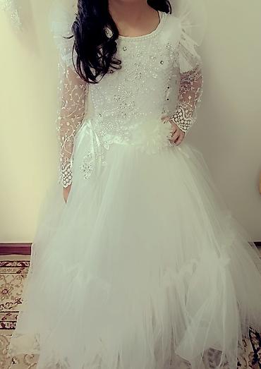 Нарядное детское платье для праздника/утренника/свадьбы (цвет: белый). Размер 40 - Верх: атлас с богатой вышивкой, аппликациями и бусинами; круглый вырез, короткие рукава. - Декор спереди: крупный...