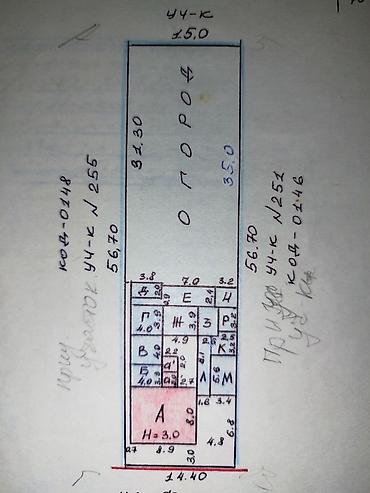- Земельный участок прямоугольной формы 15 м по фасаду, общая глубина около 81–82 м. Передняя застроенная часть порядка 56–57 м вглубь, далее большой огород ~35 м.
