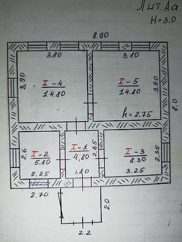 - Планировка дома по поэтажному плану: прихожая/тамбур 4,8 м², кухня 5,8 м², жилая комната 8,3 м², две большие комнаты по 14,8 м² каждая. Высота потолков: 2,75 м. На фасаде — несколько окон, хорошее естественное освещение.