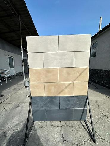 - Текстура и расцветки: ровная камневидная фактура с легким дымчатым эффектом; на стенде показаны варианты в светло‑сером, бежевом и графитовом цветах.