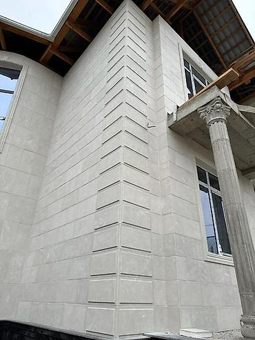 - Визуальный эффект: монументальный «каменный» фасад с четкой геометрией швов; угловые элементы придают объём и акцентируют архитектуру.