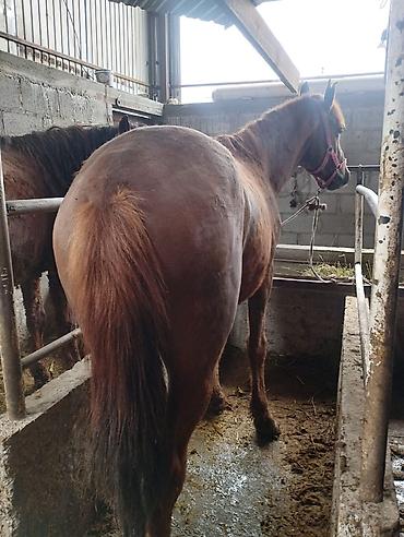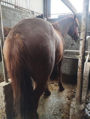 Лошадь гнедой масти с белой проточиной на морде и черным хвостом и гривой. На фото — крепкий, высокий тип, выраженная шея, глубокая грудь, ровная спина, сухие конечности. Стоит в недоуздке из верёвочного шнура. Копыта массивные, ровные. Подходит для хозяйственных работ и верховой езды, выносливый формат. Характер по фото — внимательная, энергичная, хорошо реагирует на человека. Отлично смотрится в упряжи и под седлом после базовой подготовки.