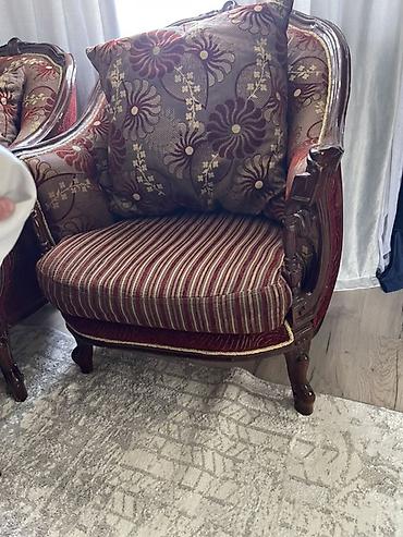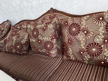 - Обивка дивана и кресел: жаккард с крупным цветочным узором (бордово-золотистые тона), сиденья — плотная ткань в бордово-бежевую полоску