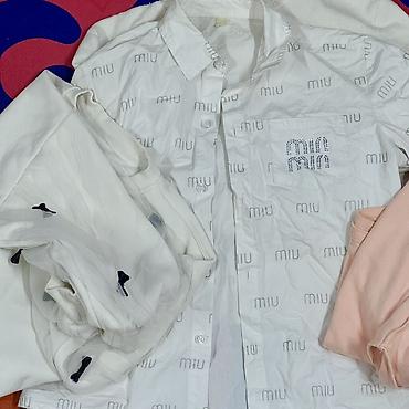- Белая рубашка с застежкой на пуговицы и отложным воротником. Ткань с повторяющимся принтом «miu», на нагрудном кармане — декоративная надпись из страз.