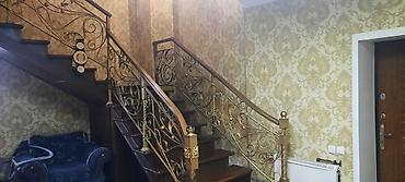 - Парадная лестница из темного массива с фигурными коваными перилами в классическом стиле, декоративные стойки с позолоченными элементами.