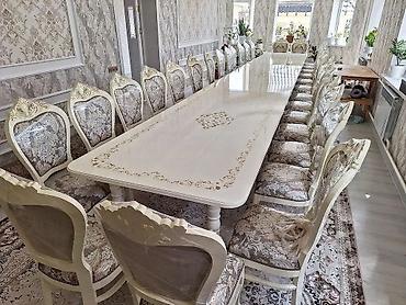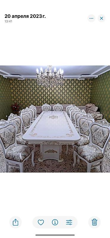 Стол и стулья королевский - Большой прямоугольный стол с фигурными опорами. Светлый глянец, декоративные золотистые узоры по кромке и в центре столешницы. - Стулья с высокой резной спинкой. Карка...