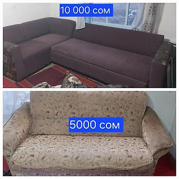 - Угловой диван, обивка темно-сливового цвета, широкое спальное место, подлокотники с узорчатой вставкой. Цена: 10 000 сом.