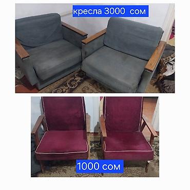 - Пара широких кресел с серой обивкой и деревянными подлокотниками. Цена за комплект: 3 000 сом.